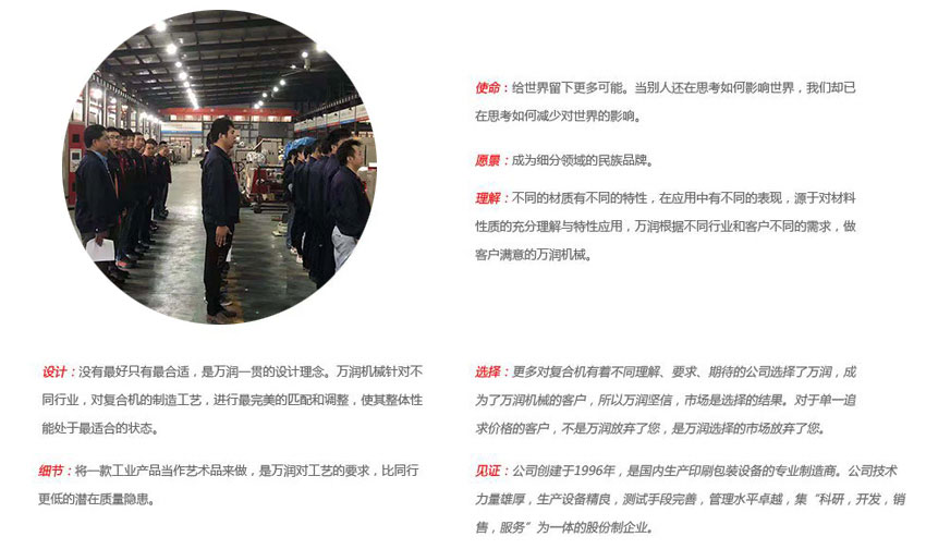 溫州萬潤機械有限公司(原瑞安市意聯(lián)機械有限公司)位于浙江省最前沿的東海之濱瑞安市。距機場,火車站30多公里,緊靠104國道,交通便利。公司創(chuàng)建于1996年,是國內生產印刷包裝設備的專業(yè)制造商。